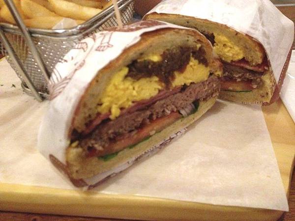 側面照,看起來漢堡沒有很大一個,但是裡面的料滿紮實的,看這個漂亮的側切面就知道囉~~