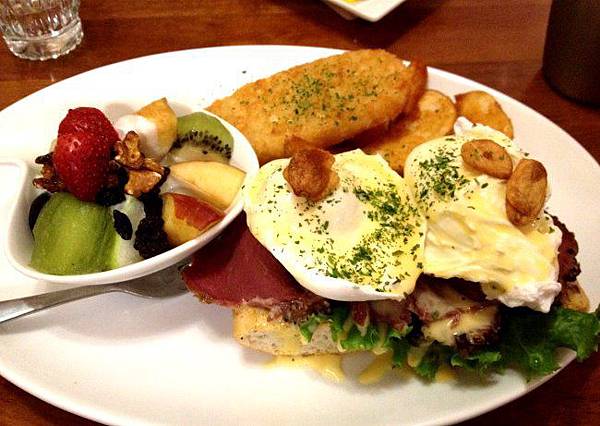 班尼克家族燻牛肉,左邊的沙拉我選擇的是水果,水果很甜很好吃,優格也不會太酸太甜,很爽口